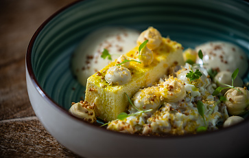 burgonya textúrák, hatperces tojás, tejfölhab, vega zsüvel