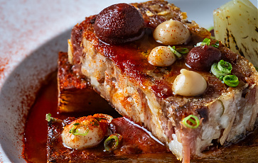 mangalica rilette, pirított rakott burgonyával, konfitált salottahagymával, rubin paprikával 3, 6, 7