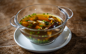 húsos nudlival, zöldborsóval, illatos gombákkal 1, 3, 6, 9