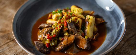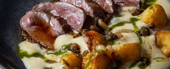 préselt, pirított combfilé konfitált zúzával és taréjjal, vajas-petrezselymes nokedlivel 1, 3, 6, 7