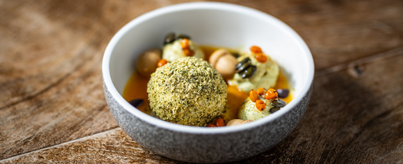füstölt-ropogós burgonyafőzelékkel, gyöngyhagymával, tárkonyemulzióval 6, 7