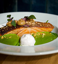 balatoni sajttal és főtt sonkával, vajas burgonyakrémmel, kapribogyó-frissítővel 1, 3, 6, 7