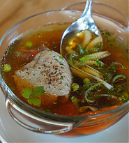 húsos nudlival, zöldborsóval, illatos gombákkal 1, 3, 6, 9