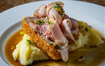 balatoni sajttal és főtt sonkával, vajas burgonyakrémmel, kapribogyó-frissítővel 1, 3, 6, 7