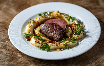 karamellizált hagymás burgonyakrémmel, ropogós hagymával és zsüvel 6, 7