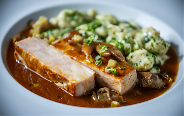 préselt, pirított combfilé konfitált zúzával és taréjjal, vajas-petrezselymes nokedlivel 1, 3, 6, 7
