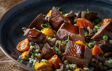rozé kacsamell, konfitált szív és zúza, zöldséges gersli rizottóval és sárgarépakrémmel 1, 6, 7, 9