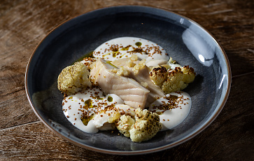 karfiolkrémmel, habbal és sült karfiollal, fermentált jégcsapretek relish-sel
