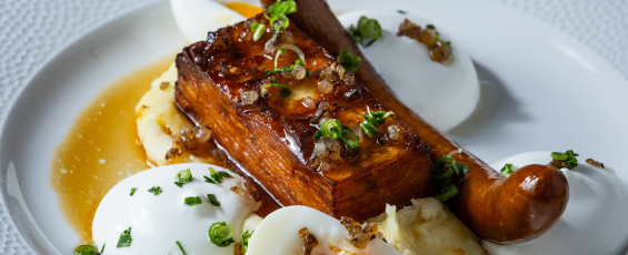 füstölt-ropogós burgonyafőzelékkel, gyöngyhagymával, tárkonyemulzióval 6, 7