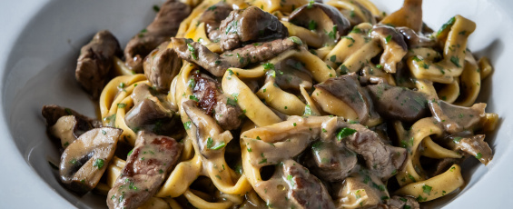 házi metélt, sült gombákkal, szarvas csíkkal, vargányás mártásban 1, 3, 6, 7