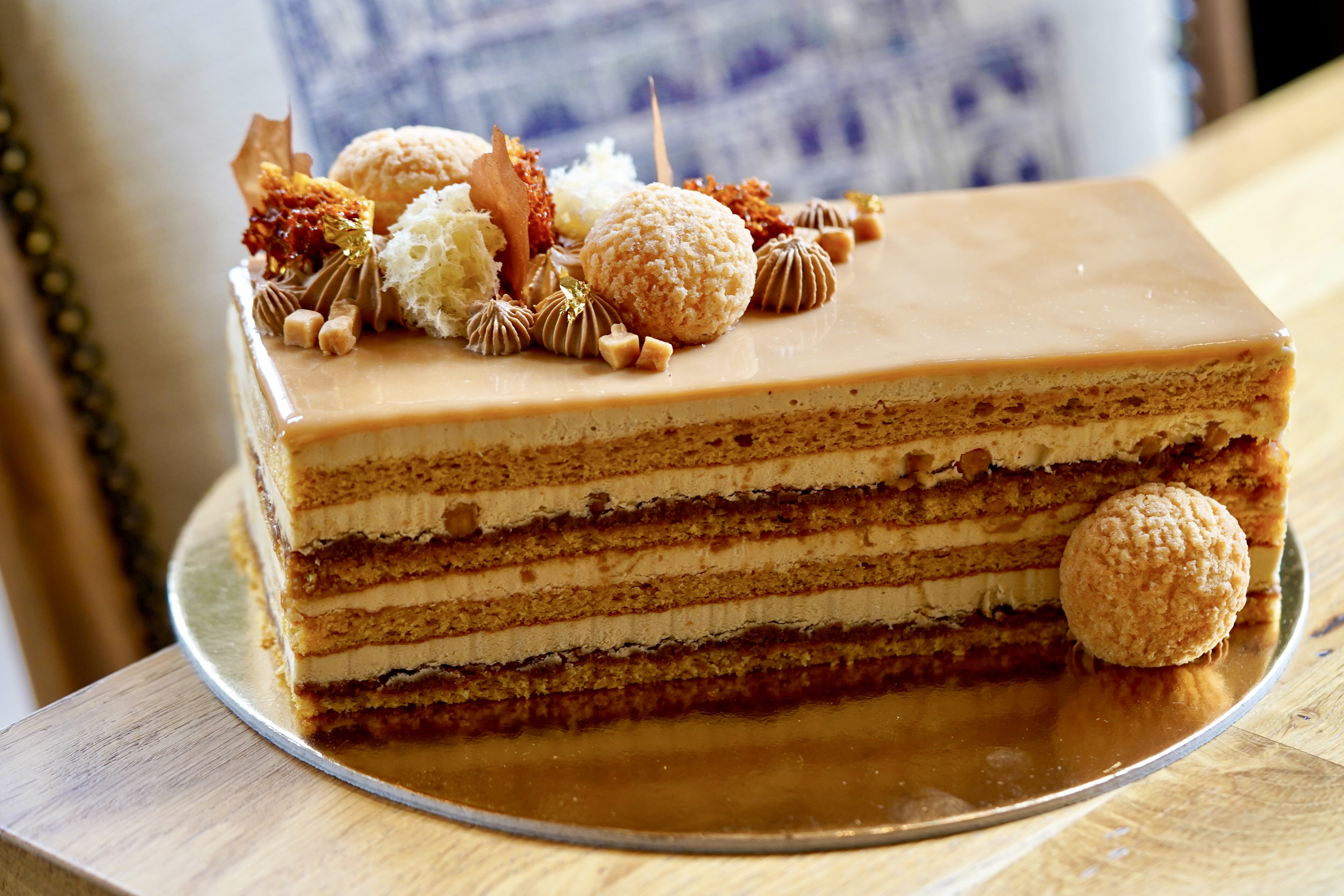 Inspired by our mother’s beloved caramel dessert, we baked four layers of light sponge cake, filled them with velvety caramel cream, and added a bit of tonka bean crisp for a surprising twist.