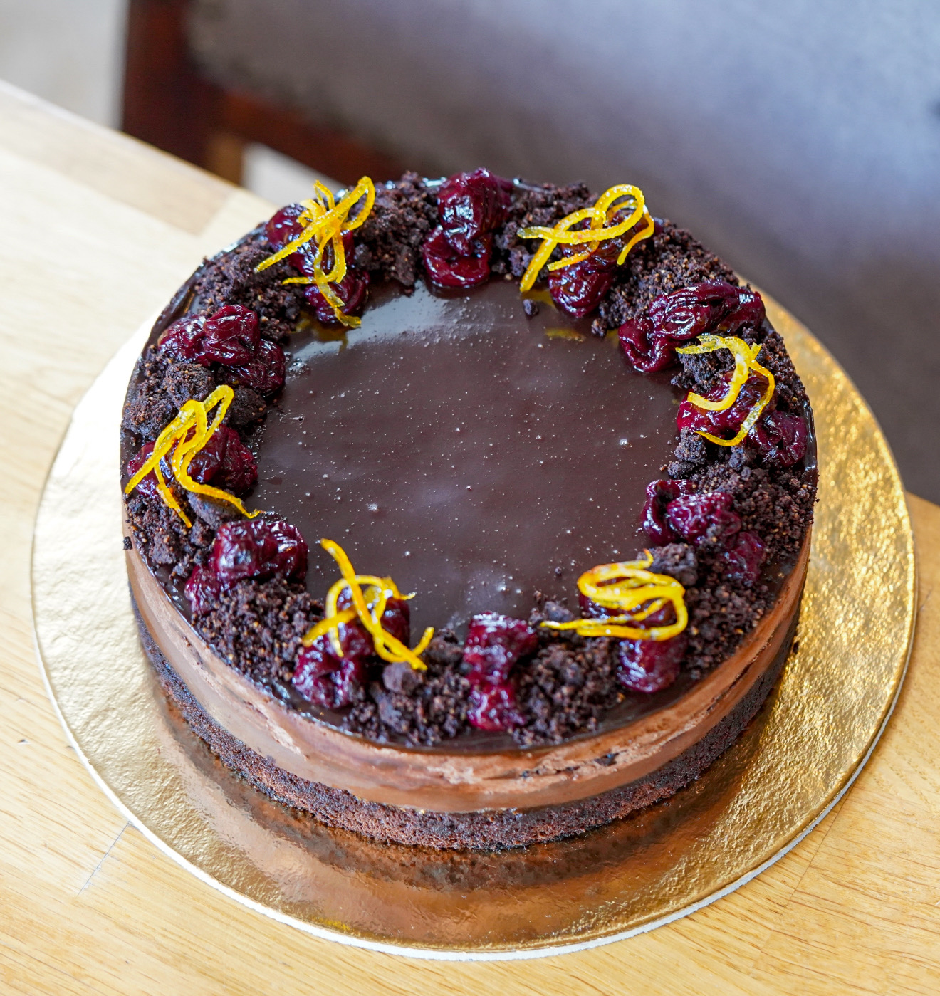On the top, a cherry compote, with aromatic cognac and a splash of Cointreau.