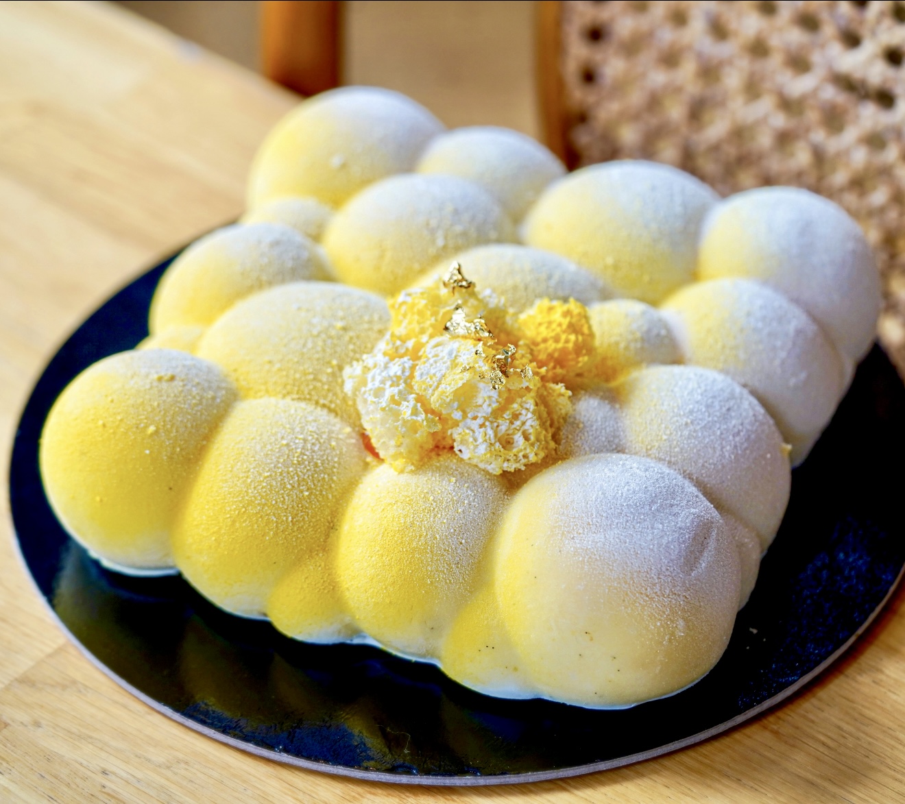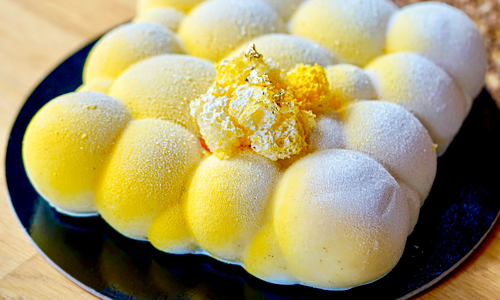 Between layers of pistachio and almond sponge, we’ve hidden a passion fruit–green apple compote, flavoured with a drop of rhubarb bitter. All this is embraced by a light citrusy coconut mousse and a touch of lemon cream.